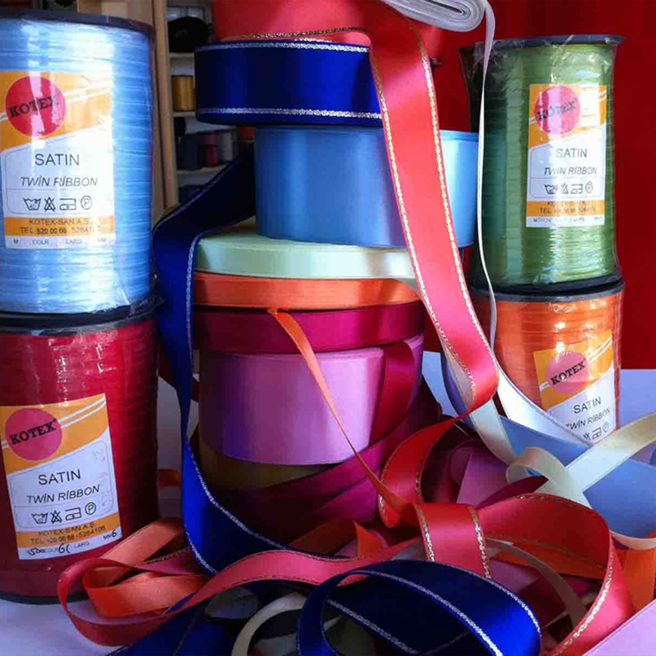 Saten kurdeleler polyester kontünü ipliklerle dokunmuş olup renk haslıkları yüksek azor ve cron gibi zararlı maddeler içermeyen boyalarla boyanmıştır.